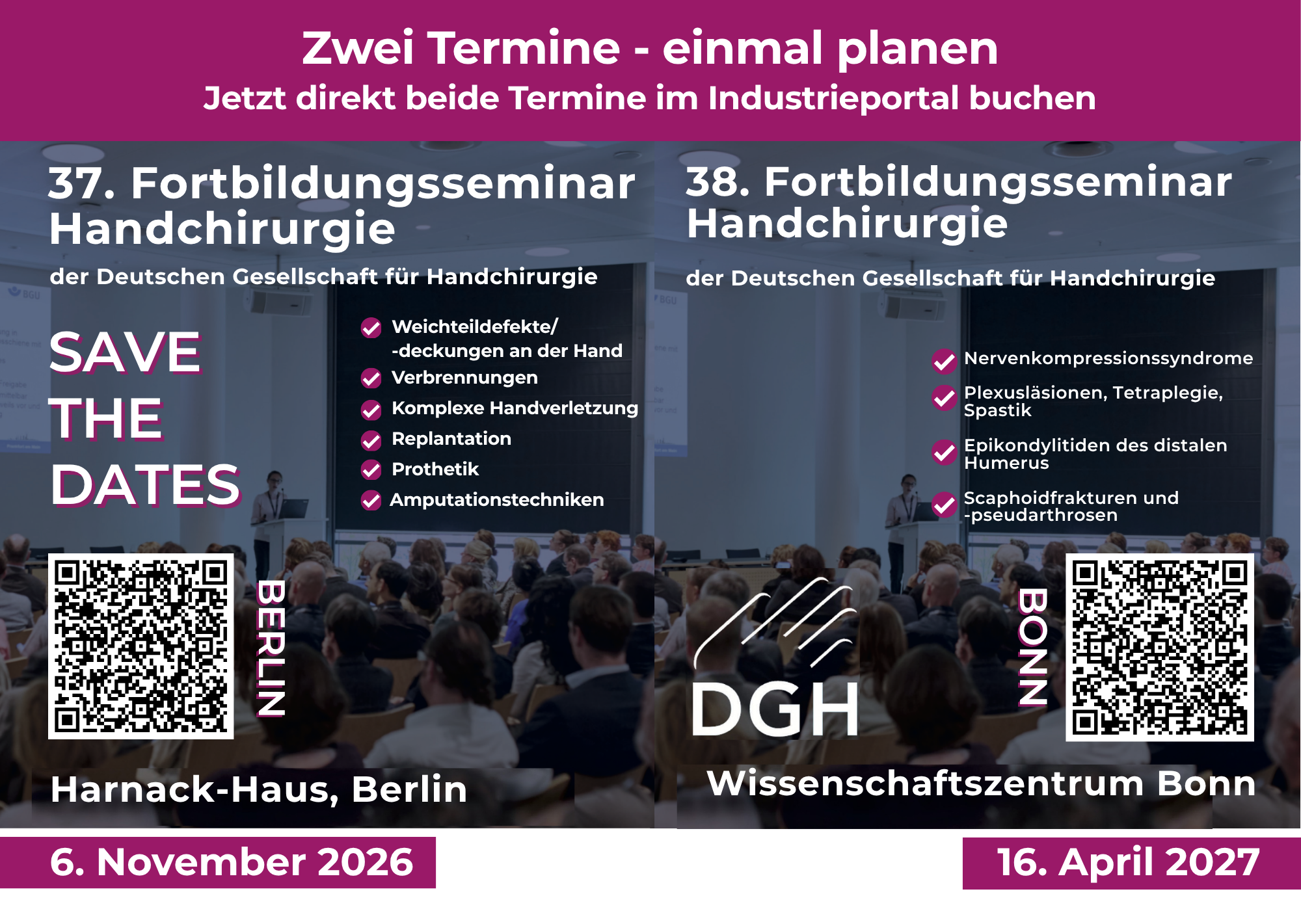 Wir freuen uns, Sie am Freitag, dem 24.04.2026, mit dem Fortbildungsseminar Handchirurgie der DGH erneut im Wissenschaftszentrum Bonn begrüßen zu dürfen.